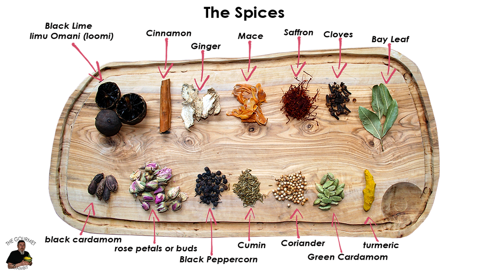 2 limu Omani (loomi), 3cm turmeric root, ½gr saffron (whole threads), 2 pieces of Mace, ½ stick of Ceylon Cinnamon, ½ tbsp of Black peppercorns, 4 green cardamom pods (seeds only), 1 black cardamom, 1 tsp cumin seed, 2 tsp coriander seed, 1 tbsp rose petals or buds, 2 slices dried ginger root, 1 bay leaf, 3 cloves