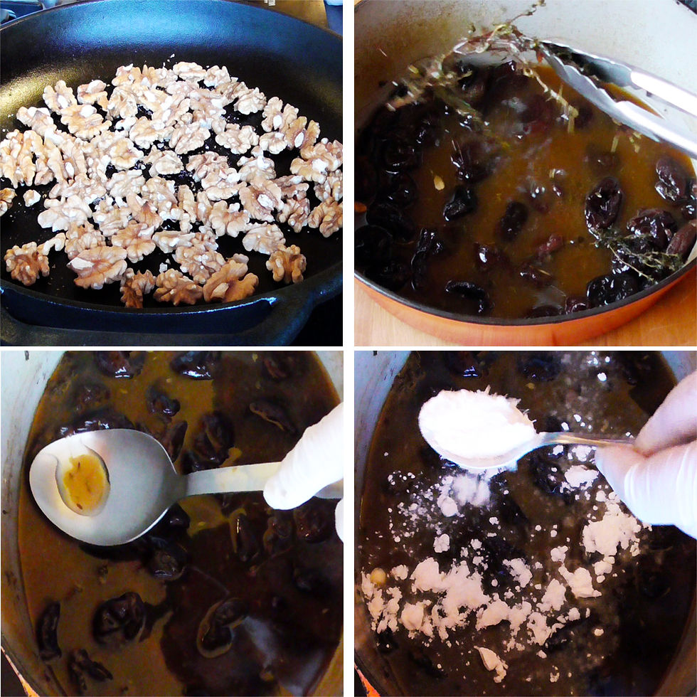 This recipe doesn’t need a lot of spices, the thyme, prunes and walnuts do a wonderful job on the duck’s savory meat.