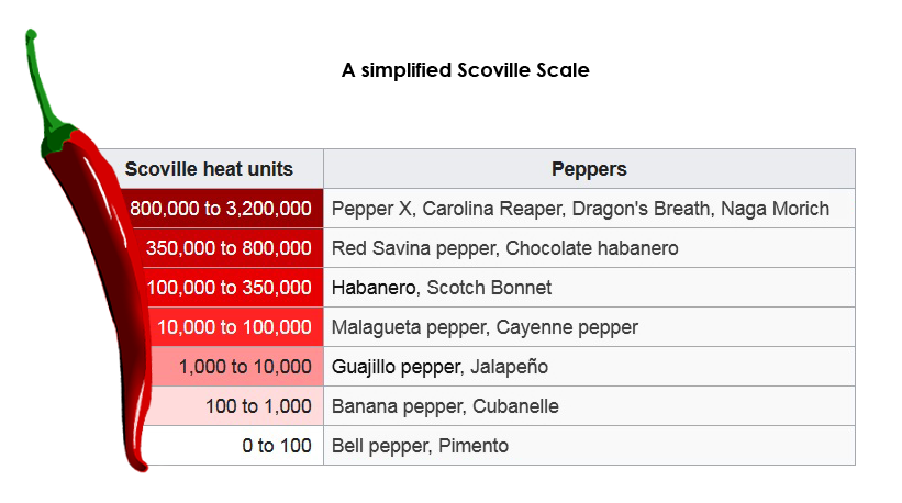 The Scoville Scale is a scale of chilli strength invented in 1912 by pharmacologist Wilbur Scoville as part of his work at Parke-Davis in Detroit. Its purpose is to inform on the spicy (pseudo-heat).